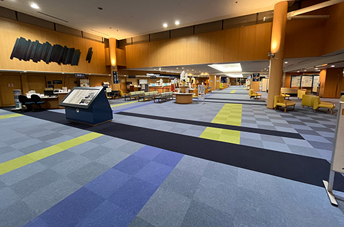 ロボフロアーの安全性や耐久性、メンテナンスが評価され、受付や廊下などに採用されました。クリーンな空間に似合う、さわやかな色使いがポイントです。